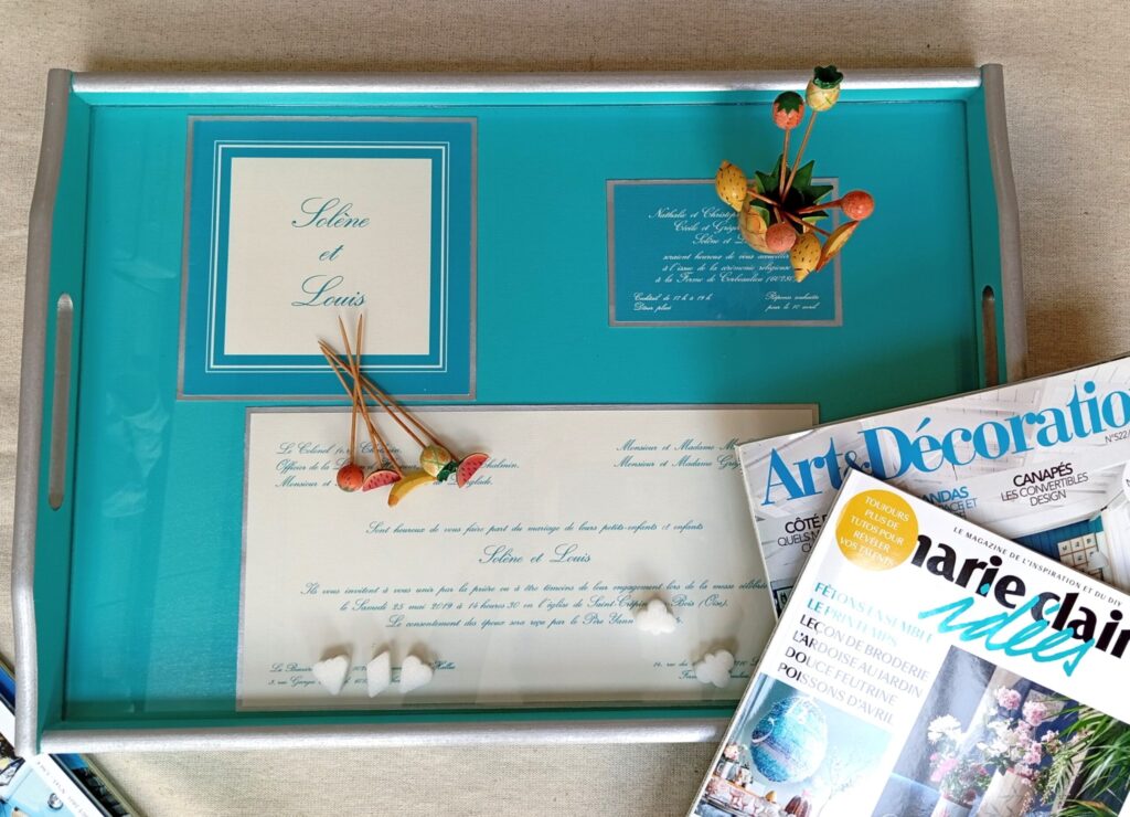 Nous vous proposons de personnaliser vos faire-part de mariage ou tout autre document que vous souhaitez encadre en les présentant dans un plateau en bois.
